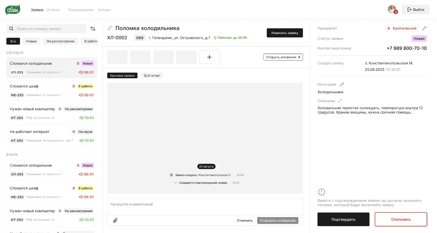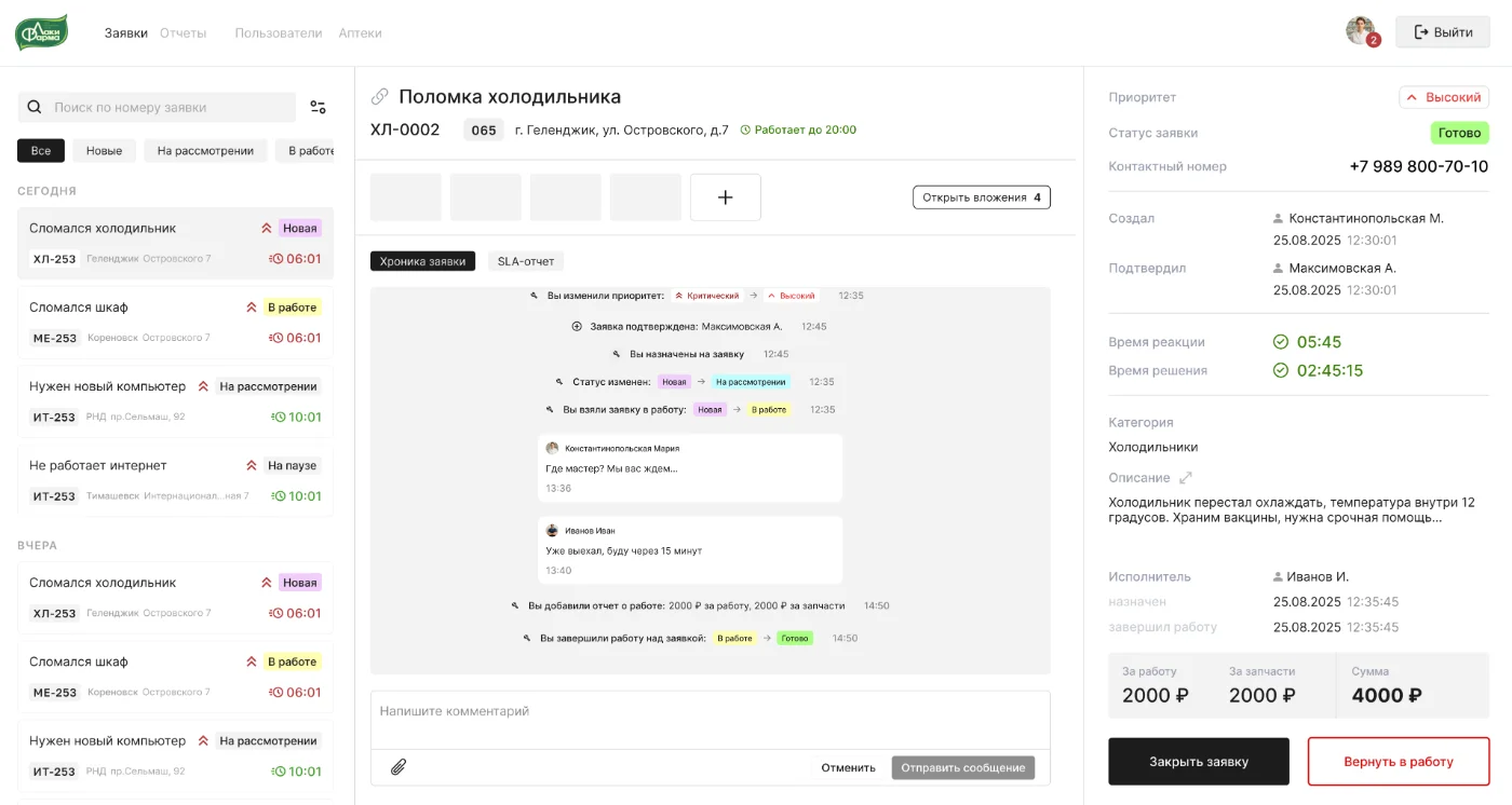 Закрытие работает по механизму двойного подтверждения: сначала техником, затем управляющим аптеки, который проверяет результат и закрывает заявку.